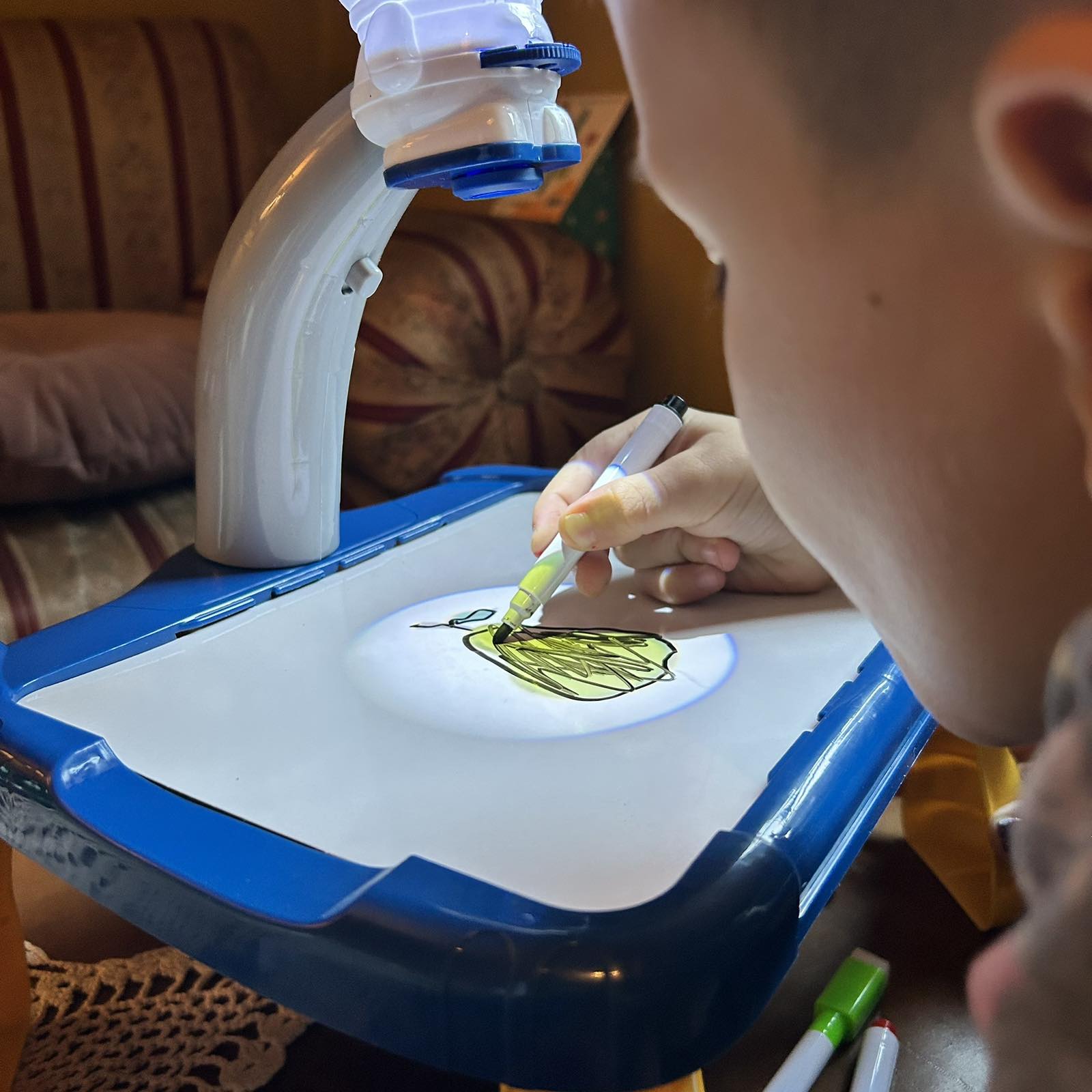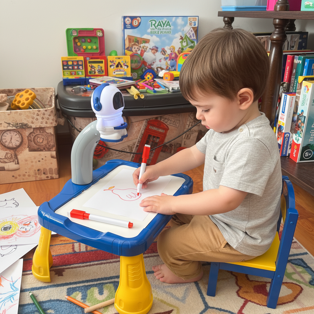 Dovoljno je da dete povuče marker po podlozi i crtež se odmah pojavljuje — bez pritiska i bez mrlja.