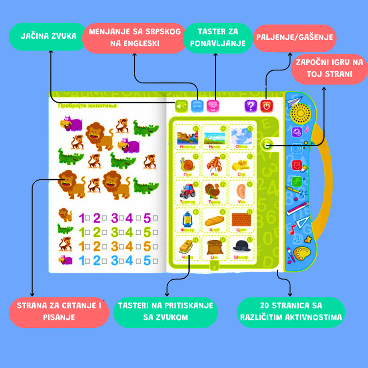 Sa čak 210 različitih pojmova, mališani će na zabavan način proširiti svoj rečnik i poboljšati prepoznavanje slova i brojeva.
